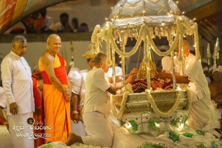At the end of this Perahara the relic casket of the pageant is deposited in the Adahana Maluwa Of Asgiri Vihara, and Randolis and Ran Audas are brought back to their respective Devalas. After an offering of Milk Rice and other Delicacie; The Devala Peraharas proceed toThe river at Gatambe with Randolis and Ran Audas. Then four Kapuralas walk into the river with water pitchers, empty the water that has collected last year, then cut the water with the sword and fill the pitcher with new water. Then return to Asgiri Vihara.There the Dalada Perahara await, their arrival to Perform the Dayal Perahara the final mid-day Perahara. after proceeding three times around Maligawa square ,at the auspicious moment,The Dalada Perahara enters Maligawa ,while Devala Peraharas enter their respective Devalas,bringing the Esala pageant to an end. Then The Diyawadana Nilames proceed immediately to President’s lodge in Kandy toreport the President, that the Perahara has been duly and satisfactorily conducted.